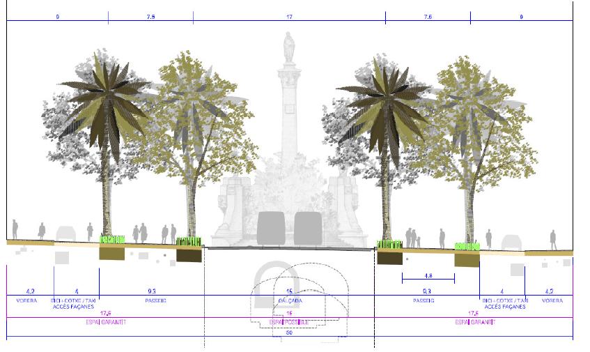 En la calzada tenemos dos únicos carriles separados físicamente (con el mismo sistema que el carril bus de la Avinguda Picasso) por sentido. El primer carril se dedicaría al tráfico en general: Autobuses, taxis, coches, motocicletas, … y el segundo al tranvía (de ahí la separación física).