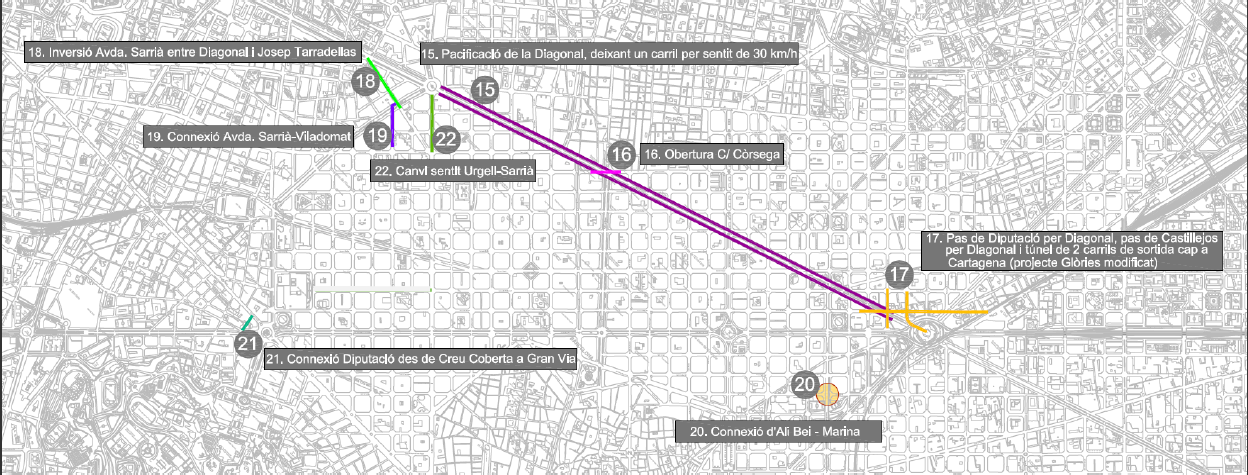En cuanto tenga un momento escribiré sobre las tres opciones. Mientras, siguiendo con el plano del principio del post, os dejo la estimación de como estará el Eixample en 2018 con la Reforma Diagonal y sus proyectos vinculados: